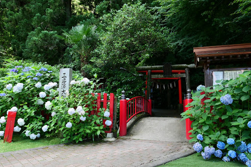 I found the shrine because I missed my stop before Ushigoebashi. 😅 It is said to be Buddhist temple but they have torii gates, so I'm not sure. They have nice patches of ajisai in the front and if you walk to the back you can find the waterfall. I hope I can come again when the weather is nicer and the flowers are...