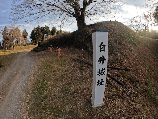 群馬県指定史跡白井城跡 白井城は吾妻川と利根川が合流し街道が交差する交通の要衝に築かれました。 城跡は吾妻川に面した河岸段丘を利用しており、台地南端に本丸、北へ二ノ丸、三ノ丸を並べています。 本丸南には南曲輪と新曲輪があるが現在は市街地化しています。 二ノ丸、三ノ丸は畑となっていますが空堀があり、本丸の東には深い横堀が巡り虎口は桝形で石垣が残っており見どころです。 【歴史】 戦国時代に関東管領である山内上杉家の家宰職として活躍した白井長尾氏の居城でしたが、越後上杉氏、後北条氏、武田氏の間で幾度も戦乱の舞台となりました。 天正18年(1590年)豊臣秀吉による小田原征伐後に関東移封になった徳川家康によって統治が進められます。 まず本多康重が2万石で入封し、その後関ヶ原の戦い後に松平康長が入り、慶長7年(1602年)井伊直孝が1万石で藩主になり、元和2年(1616年)直孝が本家を継ぐため彦根に転出すると西尾忠永が2万石で入り、元和4年(1618年)本多康重の次男の本多紀貞が1万石で取り立てられた。元和9年(1623年)紀貞は嗣子無くして死去し白井藩は廃藩、白井城は廃城となり破却されました。 【アクセス】 本丸まで車で入れますが、横堀を見学するのであれば白井宿側から歩いて散策するのをお勧めします。 看板が出ているので迷いません。