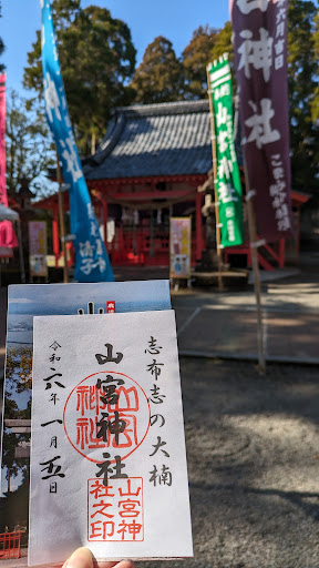 Read more2024年1月5日(金)参拝 山宮(やまみや)神社の御朱印をいただきました。 (初穂料500円)鹿児島県内の神社巡り。 御神木の樹齢約1,300年とも言われる大楠は大変見ごたえがありました。 手水舎も綺麗にお手入れされています。 境内にはカラフルなのぼりがたくさん立っており、明るい雰囲気でした。 鳥居の目の前に広い駐車場完備です。