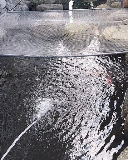サインの間には鯉駅長のさっちゃんというぬいぐるみが置かれています。これは幸せの黄色い列車王国イメージキャラクターだそうです。2016年から2019年まで実際に黄色い鯉が改札口近くの水槽にいましたが、現在は放流されています。ホームの小さな池にも鯉がいるのを確認しました。