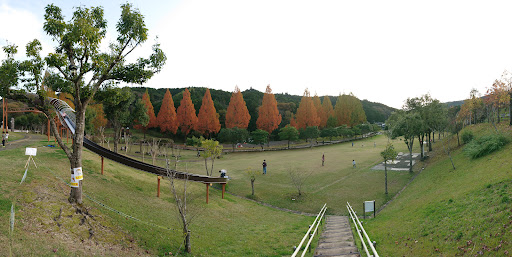 Read more開放感にあふれる広々とした公園です。さらに空高くそびえるメタセコイアの木々が、悠々とした印象ももたらしています。人工の水路が流れ、その上を飛び石で渡る遊び心もあり、訪れた人々に楽しさを提供していることでしょう。公園全体がきれいに整備されており、散歩するのにとても気持ちの良い空間です。 私は平日の昼過ぎにお散歩気分で訪れました。公園には大きなすべり台やいくつかの遊具が設置されており、子どもたちにとっては遊びがいのある場所だと思います。しかし、意外にも訪れていたのは大人が多く、その多くは公園の整備業者や隣のホールの催し物の参加者のようでした。大きなすべり台には6〜12歳の年齢制限があり、この公園がその年齢層に向けたものであることを示唆しています🛝 ピクニック用の椅子とテーブルは、親御さん達が子どもを見守るのに役立ちそうです。飲み物は駐車場付近の自動販売機で調達できます。また、公園の西端には屋根付きのゲートボール場もありました。 駐車場は広く、お手洗いもいくつかあり、気持ちの良い遊歩道があるとなると、散歩には最適ですね。季節を変えてまた...