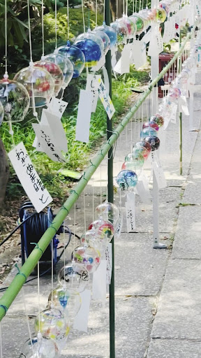 さらに、この時期に訪れたからこそ楽しめたのが「風鈴まつり」です。境内の各所に色とりどりの風鈴が吊るされ、風が吹くたびに涼やかな音色が響き渡ります。しかもそれらは既製品ではなく、一つひとつ手作りの作品。ガラスに描かれた模様や色使いがすべて異なり、それぞれに個性があって、つい一つ一つをじっくり眺めてしまいました。金魚や花火、ひまわりといった夏らしいデザインから、ユーモラスな表情のキャラクター風まで多彩で、見ているだけで笑顔になります。