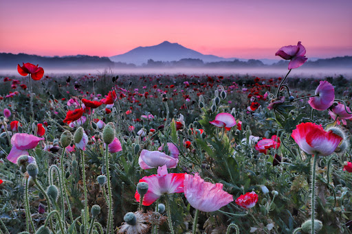 センターの裏には「こども広場」があります。 高台になっていて、ローラー滑り台などの各種滑り台がありました。 その先には、フラワーゾーンと呼ばれる大きなお花畑があります。 季節ごとに花が入れ替わり、5月にはポピー、秋にはコスモスが楽しめます。 訪れたのは5月だったので、ポピーが畑一面に咲いていて綺麗でした。背景には筑波山も見えます。
