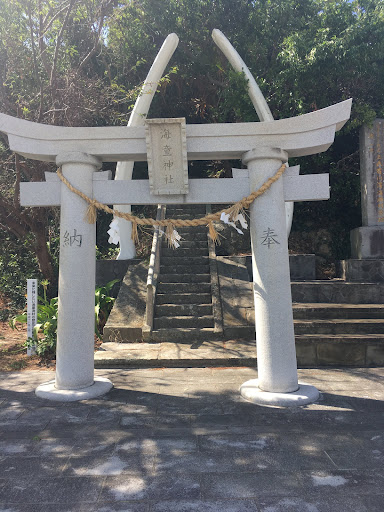 Read more🏣長崎県南松浦郡新上五島町有川郷 🅿️🚗…有ります 船…有川港からの徒歩10分程 ※ 船津地区の応護島に鎮座する神社、 鯨の顎骨を使用した鳥居が有ることで知られている… 顎骨の前に建っている鳥居は通常より引く立っているように、思えました。 ※ 創建年代は不詳 県や町の資料によると、元和3年(1617年)~5年にかけて有川村で6月17日に限って海で遊泳する大人.子供が溺死する事が続いた。 時の乙名役の高井良福衛門に海童神からの神託によって神子島に石祠を建立し、海童神を奉祀した。 と記載されている。 ※ 一の鳥居、ニノ鳥居、三の鳥居と三対の顎骨と扇型した「ヒレ」の鳥居も有ったそうですが、腐食により今は鳥居 だけが残っているようです。 ※ この神社の有る場所は平成14年頃迄は海に囲まれた応護島と言う小島だったそうです。 16年に有川港ターミナルが建て替えられた際に島の周辺も埋め立てられたそうです。 ※ 石段を少し登ると頂上付近に石の祠が有り、恵比寿様、竜神様が祀られています。 明治に24年に祖母君神社に合祀され、その後、後祖母君神社、天満神社、八幡神社が合祀され、有川神社となる。 現在は海童神は有川神社の祭神の一つとして祭られている。 ※ 参道は熱帯植物...