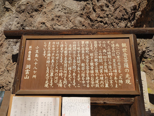 Read moreこの小豆島霊場第1番洞雲山(どううんざん)は、香川県小豆郡小豆島町坂手灘上に位置します。標高は280mぐらいかな!?ここは、第3番霊場の奥の院隼山と第2番霊場碁石山との間にあり、途中の道は急な崖沿いの細道が続く!最初に鐘桜と杉の大木が見えて来る!石段を登ると、大師堂、その右手上に〘大師お杖の水〙と呼ばれる小さな泉が。6月1日から7月の中旬の15時、晴天であれば日光の加減で〘夏至観音〙と云われる観音様の影が現れる。これが、パワースポットとして人気があるみたいである!泉から奥に行くと、切り立つた岩壁が目に入る!洞雲山本堂の入口である!岩壁に沿つて作られた登廊を行けば、洞窟の中に八角堂があり、本尊の毘沙門天が祀られている。注意点として、第3番奥院の隼山から第2碁石山までは道が細いので、徒歩で行くのが良い!!!普通車では無理、軽自動車でもかな!?第2番霊場洞雲山は駐車場なし!隼山から碁石山までは大回りして行くと、無難なく行くことが出来る!隼山も碁石山も駐車場はあるし、道幅も狭いが、難なく行ける!本日、徒歩で一人旅のスイス国の若い女性と遭遇!勇気ある!?日本は安全と...