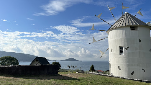 Lots of visitors gathered here to take photos of themselves posing with a broomstick for flying photos , right in front. This is to copy the heroine in the Studio Ghibli movie ' Kiki's Delivery Service.' The broomstick can be borrowed from the visitor centre for free. This windmill is constructed in the motif of Milos island, the sister island of Shodoshima. It stands in view of...