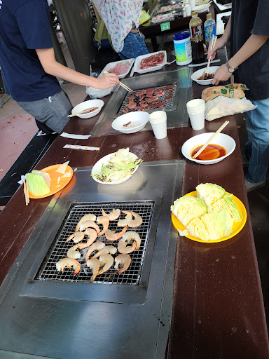 最初にトング、ハサミ、うちわ、割りばし、紙皿、お手拭き、塩、胡椒、スパイス、タレを渡されてスペースへ。材料プレートを持ってきてもらって開始 大きめの炭グリル1つ。炭に火はつけてくれているので、置いてある炭を継ぎ足しながら 大きめのゴミ箱をスペースに置いてくれてるのでポイポイ入れられて楽です