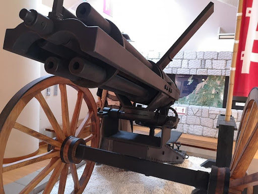 幕末、日本に3台しか無かったガトリング砲。 機関銃という名前を彼が付けました。 当時、日本に3台あり、2台を長岡藩が所有し、1台を薩摩が船の艦尾に固定して使っていました。 従って、陸上戦闘で使用したのは長岡藩が初めてです。 射程距離は分かりませんが、小説では1分間に300発。1秒で5発ですね。 この記念館には1分で200発と書いてありました。 いずれにせよ、刀を振りかざして突撃して来る敵はなぎ倒されます。 幕末期に今の核兵器に相当する高額兵器を、石高わずか74000石の吹けば飛ぶような小藩が買えたのか、何故外国人は河合継之助に特別に売ってくれたのか。 それは小説を読むなり、現地で確認してみてください。