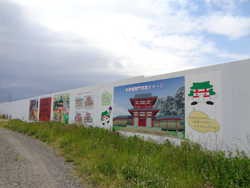 創建1300年となる令和6年/2024年の公開を目指して、多賀城南門の復元工事が行われていた。 工事中の南門には近づけなかったが、少し離れたところから見ると、ほぼ完成している様に見えた。