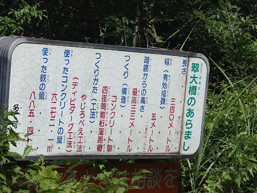 ダム湖の真ん中に「翠大橋」がかかってます。 ほとんど車の通りのないこんな場所に何故❓️ 橋の真ん中に離合出来るように道幅が広がってますが、途中で車来たらどちらかがバッグすることになりそうです。 橋の写真撮ろうとしたのですが、木の枝が邪魔で良いスポットが...