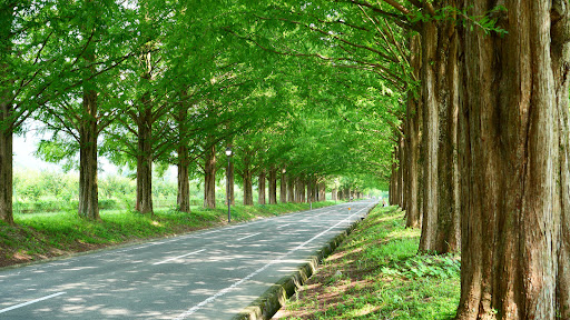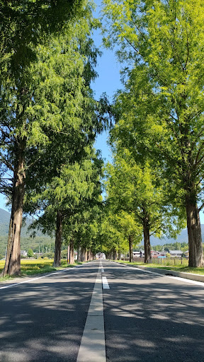 This tree-lined road in Takashima City, Shiga Prefecture, is lined with conical metasequoia trees, creating a strikingly...
