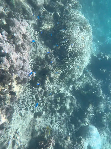 ビーチは、海に向かって、左側に珊瑚礁や熱帯魚が集中し、右側は砂地が多いが、ウミガメは砂地の藻を食べることが多いので、どこで出会えるかは運任せ。