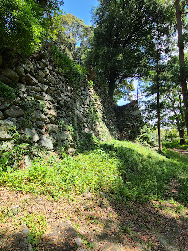 富士見門から大手門に進まず、門の後ろの道から北の丸跡へ進むと空堀に出ます そこに、このお城で最も古いと言われる石垣がありました!(富士見門からそのまま大手に進むと多分、この石垣は見逃します) 石垣の外側には空堀が巡らされてます 北の丸の石垣沿いに草を踏みながら本丸虎口へ向かいました