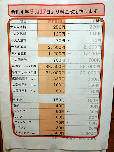 Read more令和5年1月8日(日)13時30分頃に訪問。 券売機で入湯券を購入し窓口にいた男性に渡すも、『こんにちは』とか『いらっしゃい』の一言もなく無言。さすが公営、テッパンの仕事ぶり。 お風呂は内風呂と打たせ湯があるが、内風呂一択と考えていた方がよろしい。浴場でも販売はしているようだが、アメニティグッズも持参した方がよろしい。 お客さんは出たり入ったりで、浴場内は常に10人前後の人がいる状態。【黙浴のお願い】の貼り紙通り、浴場でも脱衣所でも会話をするお客さんは一人もおらず、マナーがいい方ばかりであった。 玉名市ホームページ内の公共施設紹介にこちらの施設があるが、入浴料金は220円ではなく250円。令和4年9月から変わっている。 建物も風呂も脱衣所も古いが、250円で気持ちよく入浴が出来...