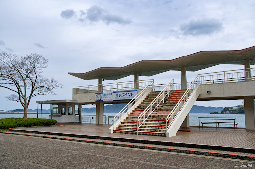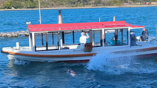 施設とサービス 海女スタンドでは、実際に海女が海に飛び込み、潜水して貝を採取する様子を見ることができます。実演は毎日数回行われ、新人海女の練習風景も見ることができることがあります。訪問者は船上から直接その勇敢な作業を見学することができます