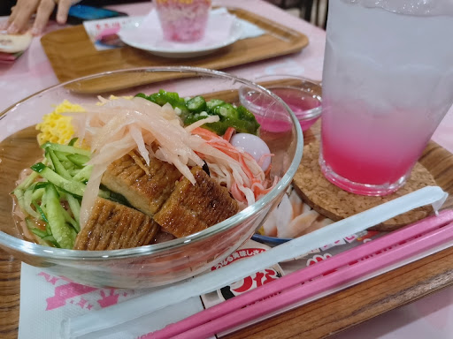 吾輩がいただいたのは、季節のオススメ系のこちら。 岩下の新生姜とうな次郎の冷やし中華~特製爽やかダレ~ とピンクジンジャーソーダ(`・ω・´)