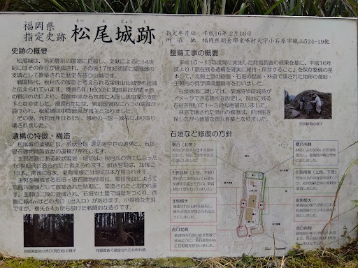 戦国時代は秋月氏の城で豊後の大友氏との激戦区だったと思われる。 豊臣秀吉の九州征伐で秋月氏が秀吉に臣従すると、松尾城は筑前を与えられた小早川家の支城となり、関ヶ原の合戦の後は小早川家の領地をまるっと与えられた黒田長政の支配下に入る。 この時、長政は豊前中津18万石から筑前52万石に移ったわけだが、移封する際にその時の豊前中津の年貢を全て取り立ててから筑前に移った。怒ったのは豊前に移封された細川忠興だ。豊前40万石のうち、半分近い18万石分の年貢を持っていかれたことになるから当然だ。 移封する際は年貢を遺して移封するというのが当時の暗黙の了解だったが、移封先が年貢を持っていってしまった場合などは移封前の領地の年貢を取り立ててから移封するというのはたびたび行われていたようだ。 筑前は小早川が年貢を持ち去っていたので、長政としても仕方なかったのだろうが、細川としてはたまったものではない。これが黒田家と細川家の不仲のきっかけとなり、その後、年貢の取り立ての厳しい黒田領から、年貢の取り立ての緩やかな細川領に農民が逃げ込む事態が頻発し、今度は黒田が返せといっても細川は応じず、これで二人の仲は決定的になったという。