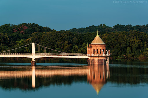 Sayama Lake, originally called Yamaguchi Lake, is a man-made reservoir that was built using an earthen dam, which was completed in 1929. Due to a lack of heavy earth-moving equipment in Japan at that time, the dam was constructed mostly by farmers who used picks and shovels. The majority of the workers were farmers hired to do the work after the growing season had come to a close. A total of 1,720 villagers were forced to leave their homes to make way for the dam as demand for fresh water increased with a population explosion in Tokyo. During WWII, the embankment of the dam was reinforced with ballistic-resistant concrete and the towers were reinforced with a bullet-proof exterior as measures against the Tokyo air raids. The design of the intake towers was heavily influenced by the trends of western architecture that were poplar in Japan in the early 20th century, as can be seen by the use of red bricks on the exterior, copper roofing, and artistic design elements above the doorway to the tower's interior. Although the bridge is currently painted white, early color photos from many decades ago show a bridge painted in a copper-red coat of paint, which makes it look like a miniature version of the Golden Gate Bridge in San Francisco. On the occasion that the reservoir is partially drained for maintenance work on the water intake towers, remnants of the villages that were submerged can still be seen. Since the reservoir is used to provide fresh water to the residents of Tokyo, the lake itself is off limits to any human activity in the water: no swimming, no boating, no fishing, etc. The hills surrounding the lake are also off limits. Except for the promenade running across the top of the dam, high fencing with several bands of barbwire encircle the rest of the hills that feed water into the lake. The lack of human access has created a small oasis of natural habitat where various species of insects, birds, mammals and flora can flourish. ★★Check out the Pix4Japan YouTube channel for a short video highlighting the vibe of...