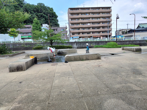 水遊びできるエリアはそんなに広くはないですが、親子三組くらいなら余裕もって遊べると思います!噴水が3つもあって子どもたち大喜びでした!川に向かってチョロチョロ流れる水に葉っぱを流すのも楽しんでました。 歩くと苔でめっちゃ滑ります、よちよち歩きの子は親が近くにいてあげたほうが良さそうです。うちのこは転ぶのも面白かったようですが笑 近くに藤棚のベンチがあって親は日陰で見れてよかったです笑