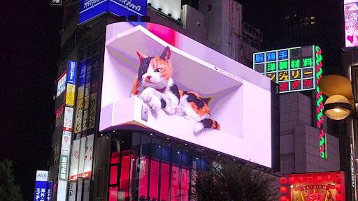 This isn’t your average screen ad—it’s a 4K, curved LED display designed to create a hyper-realistic 3D illusion of a massive calico cat hanging out between advertisements. Thanks to the screen’s shape and the high frame rate, the feline actually looks like it’s poking its head out from a physical ledge, blinking, stretching, or napping across the day.