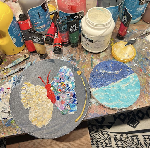 そして実際にアート体験が始まると、 ・絵の具の種類が少なく、原色の物ばかり。私が行った時は赤・青・水色・緑色・茶色・紫・ピンク・金・銀のみでした。 白い絵の具も無いとのことで淡い色の作品を作るのはこの段階で諦めました。 ・講師の方は基本的に近くにいるのみで、材料の説明をした後は放置という感じでした。こちらからの質問には答えてくださいますが、上記の通り日本語に若干の不安を感じる部分があり、アドバイスなどはあまり期待出来ませんでした。 ・入室から1時間ほど経過し、作品をほぼ作り終えるあたりで「ラメもあるので使ってください」と出されましたが、すでに絵の具のみで塗った部分は乾き始めている頃でした。