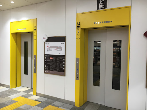 島式ホームは2層構造で、上り新宿・本八幡方面が地下3階ホーム、下り橋本・京王八王子方面は地下2階ホームです。改札口は地下1階にあります。改札内には、上り新宿方面ホーム階への直通エスカレーターもございます。各ホーム階を結ぶ大型の東芝エレベーターも2基あります。現在階は大きな文字で示しています。