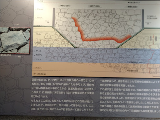 この石垣は、虎ノ門から続く江戸城外堀の一部です。この石垣は、寛永13年(1636)に築かれたものですが、部分的に不揃いな積み方があることから、数度も改修されたと考えられます。石垣表面には石を割った矢穴や構築大名を示す刻印がみられます。 もともとこの堀は、石として高さ9mほどの石垣が続いていましたが、現在はその一部が点在して残るだけです。ここでは、長さ20m、高さ7.4mの石垣をすべて保存したうえで一部埋め戻して、変形をきたした石垣を伝統技法によって旧態に戻す解体修理を実施しました。 この展示室と旧庁舎中庭石垣では、外堀の堀底および推定される水面の高さを表示し、正面の石垣は水面からそびえる石垣の姿を再現しました。当敷地内には3カ所で石垣を公開するとともに、石垣のラインを表示しました。これによって、江戸城外堀跡と現代の街区との比較が現地で確認できます。積替の石は同じ外堀の丸の内一丁目遺跡のものを使用しました。