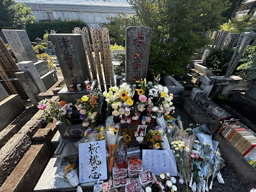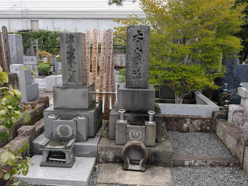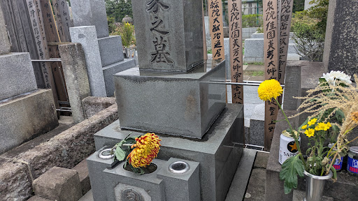 Read more昭和の私小説文学の傑作を数多く著した太宰治氏の墓です。三鷹の禅林寺にあり、故人が敬愛した明治の文豪森鴎外(森林太郎)氏の墓のほぼ向かいに設置されています。彼が入水自殺し発見された6月19日は桜桃忌と名付けられ、多くのファンがこの地を訪れます。三鷹駅から三鷹通りを800メートルほど南下し、八幡大神社の大鳥居の角を左折するとすぐ禅林寺の入口があります。こちら側からしか境内には入れません。本堂左側にスロープがあって、そこを道なりに抜けると墓地に入れます。墓参時間は午前8時から日没までと書かれていました。太宰氏の墓はずっと奥の大きな桜の木のそばにあり、彼の戒名である「文綵院大猷治通居士」と記された卒塔婆が立てられていました。訪問したときは美しい花が供えられており、吸い込まれるよ...