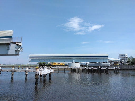別投稿した森ヶ崎海岸公園からだと間近に見ることが出来、その構造と全容が良く分かります。 周囲は川沿いの堤防と森ヶ崎水処理センターの排水口があり、堤防部は水際まで降りれるようになっているため釣り人に来る人も。