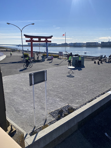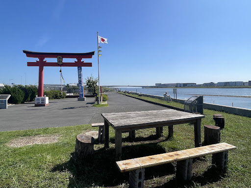 This is the former entrance torii to old Anamori Shrine, which was razed to allow construction of Haneda Airport. At the time, the large torii was constructed and placed very firmly in the ground so it was left as-is and surrounded by the old airport terminal parking lot until airport expansion work required it to be removed. Due to the passion of the local residents, it was moved to its current location on the bank of the Tama River at Benten Bridge in 1999. This is not the site of the original shrine, which is now under Runway B. The torii is beloved by locals and visitors and now is a focal point for cyclists, runners, hikers, walkers and locals to relax along the river bank. The area is managed and maintained by a local civic group of volunteers who kindly provide outdoor tables and chairs for public use. The torii now serves a new purpose, at the "Peace Torii." Visitors can ring the bells and pray for peace. The rebuilt Anamori shine is located a short 10 minute walk along highway 311.