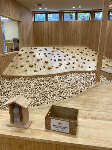 卵形状の木製の玉が敷き詰められた滑り台&幼児用のボルタリングエリアでは、卵に軽く潜ってみたり、滑り台を滑ってみたりと色々と遊び方を考えていました。 僕はこの卵形状の木製の玉が気に入り、帰り際にお土産で買いそうになりました。 樹種により値段設定があり、1300~1600円程度ですが、一個での使い途が思い浮かばず、購入を見送った次第です。 今考えるとツボ押しマッサージ用として買っといて良かったかなとちょっと後悔です。