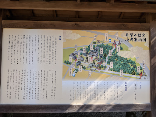 ・・・・・・・・・・~ [概要情報] 開門時間:1月 06:15/2月 06:00/3月 05:30/4-8月 05:00/9月 05:15/10月 05:35/11月 05:55/12月 06:15 閉門時間:1月 17:00/2月 17:20/3月 17:40/4月 18:00/5-7月 18:30/8月 18:00/9月 17:40/10月 17:20/11月 17:00/12月 16:40 アクセス(電車):JRおよび地下鉄荻窪駅・JR西荻窪駅・西武新宿線上石神井駅下車 アクセス(バス):JR荻窪駅北口0または1番乗場より 井草八幡宮下車(バス)JR西荻窪駅北口2番乗場より 桃井第四小学校下車 アクセス(バス):西武新宿線上石神井駅より 西荻窪駅行き乗車 桃井第四小学校下車 御祭神:八幡大神(やはたのおおかみ)/応神天皇 御由緒:井草八幡宮は、南に善福寺川の清流を望み、今なお「武蔵野」の面影残る秀麗の地に鎮座し古地名を冠して遅野井八幡宮とも称せられました。善福寺川の源泉である善福寺池が豊富な湧水であったことから、この付近にはかなり古くから人々が生活していたと考えられ、境内地及びその周辺地域からも縄文時代の住居跡や土器等が発見されています。 当宮は創建当時、春日社をお祀りしていましたが、源頼朝公が奥州藤原泰衡征伐の際に戦勝祈願をして立ち寄ったと伝わっており、それ以来八幡宮を奉斎するようになりました。奥州平定後、源頼朝公が報賽のため手植えしたと言われる松が当宮社殿前に雌雄二本植えられておりましたが、雌松(赤松)は明治初年に枯れ、都の天然記念物であった雄松(黒松)は昭和四十七年に強風で大枝が折れ、翌年には残念ながら枯れてしまいました。(現在は、二代目の松が植えられています) 源氏が八幡神を氏神として尊崇したことから武神の性格が強く、室町時代には石神井城の豊島氏征伐のため、扇ケ谷上杉家の執事太田道灌が戦勝祈願をしたとも伝えられています。江戸時代には、三代将軍徳川家光による六石余の朱印領 (将軍の朱印状によって領有を認められた土地)の給付、また寺社奉行井上正利に社殿造営をさせるなど、篤く崇敬されていました。 また、旧上井草・旧下井草は、正保二年(一六四五)以降、奥高家である今川氏の領地となり、とりわけ今川氏堯によって寛文四年(一六六四)に本殿の改築等なされ、寄進された一間四方の本殿は杉並区最古の木造建築物となり、現在も本殿として覆殿に納められています。 明治以降も氏子崇敬者によって社殿の改修、境内の整備が行われ、都内でも有数の広さ(約一万坪)を誇り、現在は神社本庁別表神社に指定されています。(井草八幡宮HP引用) ・・・・・・・・・・~