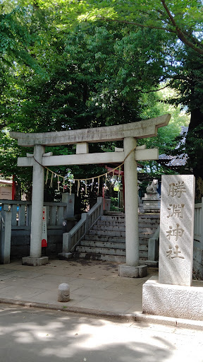 柴田勝家の孫柴田勝重が、大阪夏の陣の後に上仙川村(現新川)・中仙川村(現中原)付近を支配地として受領し島屋敷に居住、祖父より与えられた兜を水神の森に鎮めて社殿を建立し勝淵明神社と号したといいます。との事です