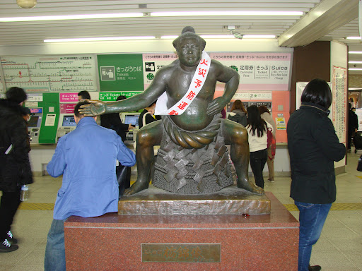 The 小岩駅 Koiwa Train Station has a statue of the 44th Yokozuna (Grand Champion Sumo Wrestler), 栃錦 Tochinoshiki in the ticketing lobby. Tochinishiki is in the rising pose of the Unryu yokozuna dohyo-iri. He won the Emperor's Cup ten times in his career. It seems passers by rub his rear end. The banner across his chest is in promotion of...