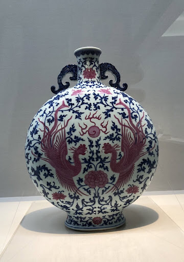 その中から、企画展1「館蔵 東洋陶磁器名品選 松岡清次郎の志をたどる」では、選りすぐりの約40件の東洋陶磁(とうようとうじ)を購入順に蒐集(しゅうしゅう)エピソードを添えて展示してあり、美術館設立のきっかけとなった2つの作品「青花龍唐草文天球瓶(せいかりゅうからくさもんてんきゅうへい):中国・景徳鎮窯 明時代 永楽 1403〜1424年」と「青花双鳳草虫図八角瓶(せいかそうほうそうちゅうずはっかくへい):中国・景徳鎮窯 元時代 14世紀 22〜23万ポンドで落札」は、約7年ぶりの同時出品とのことです❗️