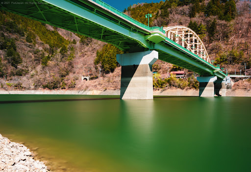 Solid-Ribbed Arched Bridge A 30-second long exposure of Miyama Bridge--a solid rib arched bridge that was built in 1957—connects the northern shoreline of Lake Okutama with the southern shoreline. The color of paint used on this bridge closely matched with the color of the water on this particular day. ★★Check out the video I made for this photo shoot at the Pix4Japan...