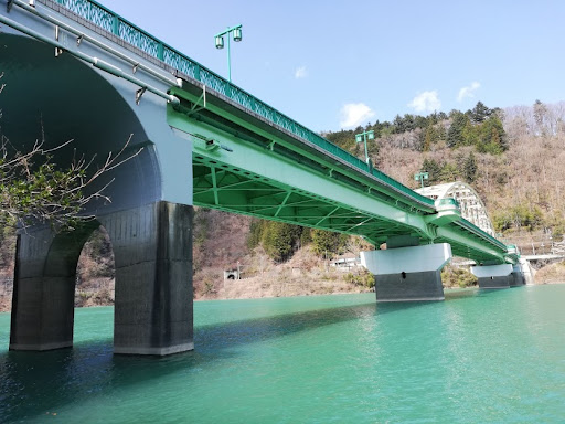 Read more奥多摩湖の最奥で丹波川方向を跨いでいる橋。1957年(昭和32年)に架橋された下路式鋼ランガー桁橋。橋長200.2m、支間長90.0m、幅員9.6m。両端の桁橋部分は、コンクリート製アーチ型橋台端部に乗っているが固定はされていないゲルパー桁になっている。 国内最長のランガー橋であり、橋脚高は竣工時国内最高の42m。その大部分は水面下であり見えないが、実は急峻な谷間の高所に架けられた橋であることを想像しながら眺めると楽しい。 中央にはバルコニーも備えていて、足を止めて湖を眺めるにもよい。 夜になると橋灯の明かりが湖面に反射し、橋のフォルムと合わさって美しい。 奥多摩湖周辺は、当初観光地として開発される計画だった。そのため、湖畔を通る橋は観光資源となり得るよう、外観にもこ...