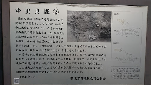 The Nakazato Shell Midden is an archaeological site in the Kaminakazato neighborhood of Kita-ku, Tokyo, in the Kantō region of Japan containing a middle Jōmon period shell midden, extending about 1.1 kilometers from Kami-Nakazato Station to Tabata Station.