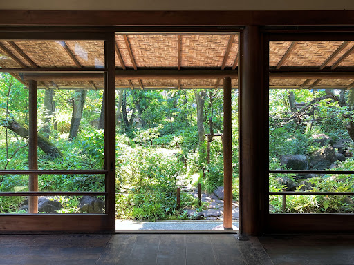 一方通行の道路を挟んだ向かい側に、令和六年に記念館と共に国登録文化財に指定された旧宅とアトリエが残されており、どちらも決まった時間に30分程度見学可能です。アトリエは入れる人数の都合からか、事前予約制となっています。 ガイドさんによると、青石、竹、石畳が特に見所だそうです。〇△▢に形どられた水鉢の水面から見える青石が色鮮やかでした。