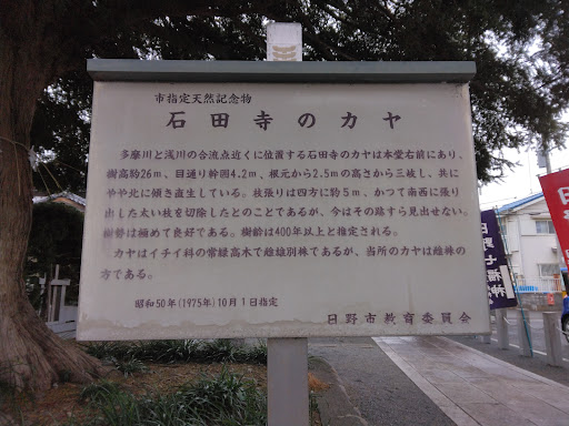 山門を通って初めにびっくりしたのは大きく太いカヤの木。高さ26m、樹齢400年を越える巨木で、小雨が降っていても木の下では傘が不要でした。日野市指定の天然記念物に指定されています。