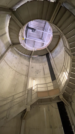 魚道管理等に入ると正面に縦穴があり、その横に男性職員が2人居ました。私たちが子供連れだからかダムカードをくれたり周辺のおすすめスポットを教えてくれたり、色々と親切にしてくれました。無料での見学なのに頭が下がります。 27mある縦穴の螺旋階段を降りていくと、目的の魚道があります。子供用に脚立も用意されていました。 魚道は上から見れば直線ですが水の流れを抑えるためにか複雑に入り組んだ迷路の様な水路になっています。 魚が迷わずに行き来できるのか不安になりますが実験を繰り返してたどり着いた形とのことで、魚にとっては問題ないそうです。 私が行った際には運良く?魚を一匹見つけましたが、動きが早く見失ってしまいカメラには収められませんでした。