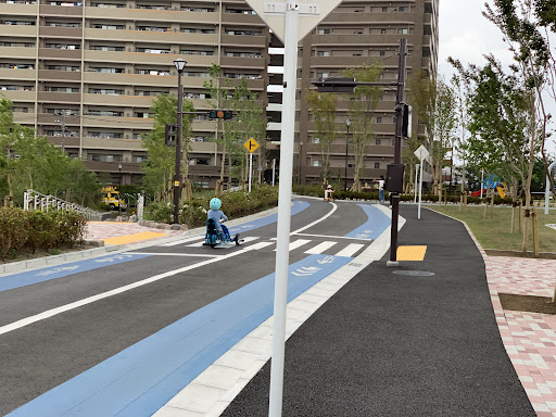 この公園は、今井交通公園から移転して新しく整備されたそうで、とてもきれいで清潔感があります。園内はそこまで広大ではなく、むしろコンパクトにまとまっているので、子どもを見守る親の立場からすると視界を遮られることも少なく、安心して過ごせます。施設のメインは自転車や三輪車、ストライダーや足踏み式・ペダル式のゴーカートなど、さまざまな乗り物を無料で貸し出してくれるところで、ヘルメットや肘・膝あても一緒に借りられるので本当にありがたいです。子どもの成長段階に合わせた乗り物が揃っていて、三輪車からストライダー、補助輪付き、補助なしの自転車と、自然な流れで練習を積むことができます。信号や標識も園内に設置されていて、遊びながら交通ルールを覚えられるのがこの公園の一番の特徴だと思います。シルバーのスタッフの方々が常に見守っていて、赤は止まって、青は進んでいいよと声をかけてくれたり、ルールを守れた子にはしっかり褒めてくださるので、子どもも楽しみながら学べているように感じます。