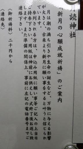 (R6.10.23再々リニューアル。ぼっちな天照話)月読み神社トリビア💡新月の度に行われる神社の特別な祭礼に足を運びました。「栗木御嶽神社Twitterで確認を」※夜7時から始まります。笙の生演奏が聴けます。2000円の奉納と願い事の奉納。祝詞と、共に、『月読の命に願いを絵馬のように奉納する儀式を行う』ラストに、榊を1人ずつ2組になり奉納して、最後に御神酒(未成年は甘酒のパターンw)を、口にしてから、大麻を頂きます。希望者は、月読神社の御守りや、神鈴を購入出来ます。 神社トリビア💡月読の命は、八百万神の中でもいらっしゃる神社が限られている。この月読神社の他に、今熊山の今熊神社(奥宮)・相模原の月読神社・西照神社・海老名市の日月神社・横浜市保土ヶ谷の外川神社・神明社内境内社・伊勢の月夜見宮と月讀宮。…普段の上麻生の御朱印が欲しい方は栗木御嶽神社に電話を入れて在社を確認して御朱印を♪(´∀`)b 特別なミニトリビア💡カラス天狗殿に特別に教えて貰った『月読トリビア』→「月読は、伊弉諾が呼び起こした遥か古来の神々の末席の1人である。主たる役目は、その優秀な頭脳を用いて、地球上のあらゆる出来事に目を光らせて、宇宙から月を観測・・・世界的に起こり得る事象を瞬時に計算しつくす事なり」……伊弉諾神が、参拝者について、『御利益は何を?』月読神『うむ。月は関係無い。玉に悪戯のように二次を大地に賜るくらいか。大きな御利益を求めるのなら、散財覚悟で伊勢の月夜見宮か、月讀社にて参拝するか、この月読神社にて、「財を蓄えさせて下さい。と、月夜見宮に御伝え下さい」と、云えば、荒御魂の我が叶えよう(笑)!』『ここまで文章を読み更けた者だけに教え足るわぁ~~・・・「たま大明神」の話を運んだのは月読の命・・・月詠みが外出中に起きた鎌倉の大津波…神代にとっても杜撰なアマテラスの尻拭い?をした「唯一の月詠み、の名前が失われた経緯」…ジブリのもののけ姫が浮かびそうな、「聖なる秘話!が、読めるのは、“甘縄神明宮”」…の、🟣fuの口コミを開き、詳細まで読めば、名前が失われた意味が分かる。忌み名ではないのだε≡≡ヘ(...