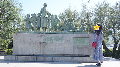 「土庄町:平和の群像」 2024年5月に立ち寄りました。土庄港の入り口にあり、小説『二十四の瞳』の登場人物である女性教師と12名の生徒をモデルにした群像です。