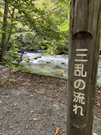 離開「瞰湖台」後我們一路搭乘「タクシー」前來大約26分鐘可以抵達,溪流位於返回飯店的順向車道左側上,比較特別的是看似不深但強勁的溪水如奔騰般湍急,這與上回在「かみこうち」的「明神池」散策時一旁所看到的溪流差異頗大,這種流速大概與「明神橋」上看到的「梓川」相同,因此才被列為必來景點之一。