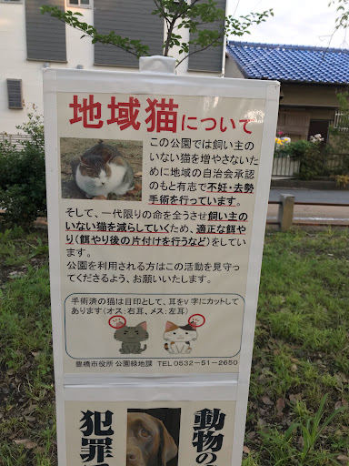 Read moreR1.08 こちらの公園は地域猫活動を行なっているようです。 自分は午前、午後と何度か利用しましたが、今までに一度も地域猫に会ったことはありませんが、こういう活動がきちんとされている公園はとても素晴らしいと思います。 また、長い公園ですが、遊具や噴水と色々あります。ベンチも多いです。 夏の暑い時期には必須の自販機も何箇所か設置されているのも良いです。