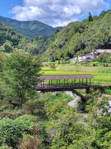 Read more内子地区の周辺によく見られる屋根付きの橋です。同種の橋としては、例えば鳥居元橋は国道56号線沿いにある橋なので最も手軽に渡ることができます。 橋の手前には説明看板が設置され「この橋は田丸橋といい、杉皮でふいた屋根付き橋です。幅2m、全長15m、橋桁を両岸から斜めに渡した木材で支え、橋脚を省いた構造です。これは昭和18年(1943年)、洪水で橋脚に流木がからまり流失した経験から、地元大工の工夫で河川をふわりとまたぐ姿となりとました。」とある通り、木製方杖形式の杉皮葺き屋根付き橋として、土木遺産にも指定されています。同様の構造のものは、ここから更に上流に架かる「下の宮橋」があります。 内子駅や中心市街地からは町営デマンドバス石畳線で容易にアクセスすることができま...