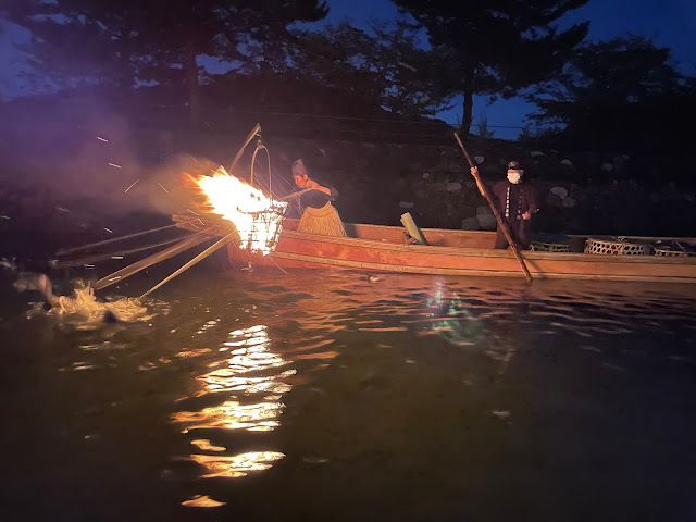 風折烏帽子に腰蓑をまとった伝統の衣装で 松明(Taimatsu)の下(Moto) 6羽を巧みに操る女性鵜匠が 今宵も幽玄で雅な平安絵巻をくり広げる。 そうして あがってきた鵜から吐き出される銀鱗に 周りの屋形舟から どよめきと 喜び そして拍手が一斉にわき起こる。 真夏の夜の風物詩は およそ3ヶ月間 歓声と拍手に沸くのである。