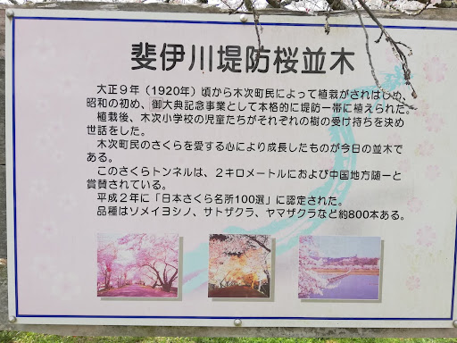 ▼斐伊川堤防桜並木の歴史 斐伊川堤防桜並木はもともと木次町民によって、大正9年(1920年)に植栽が始められました。 その後、昭和の初めごろ、記念事業として本格的に堤防一帯に桜が植えられます。 植栽後は、木次小学校の児童たちがそれぞれの樹の受け持ちを決めて世話をしたそうです。