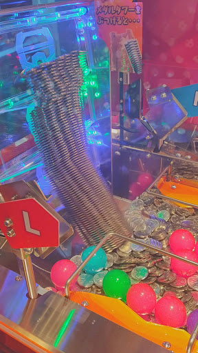 ゴムボールにバウンドさせて落とすタイプもアームが落とすところがゴムボールの中心から明らかにズレており、必ず元の位置の方向へ戻る仕様です。商品をギリギリで持てれば修正できると思いきや、そのタイプの物には筒状の商品が多く、ギリギリを持つことが出来ない→落とせません。商品が倒れたり位置が変わったりが複合し、ようやく落ちるかなという感じですが、何故か店員さん、そういう時に限り元に戻すのが早く…(笑)こんな感じの台ばかりですのでUFOキャッチャーやりに来るなら近くのラウンドワンをオススメします。